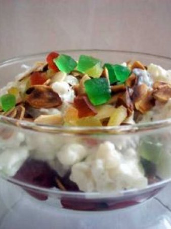 Для этого взбиваем сливки с 1 ст. ложкой сахара до густоты, добавляем их в рис и перемешаем.